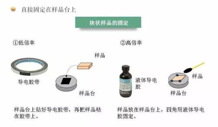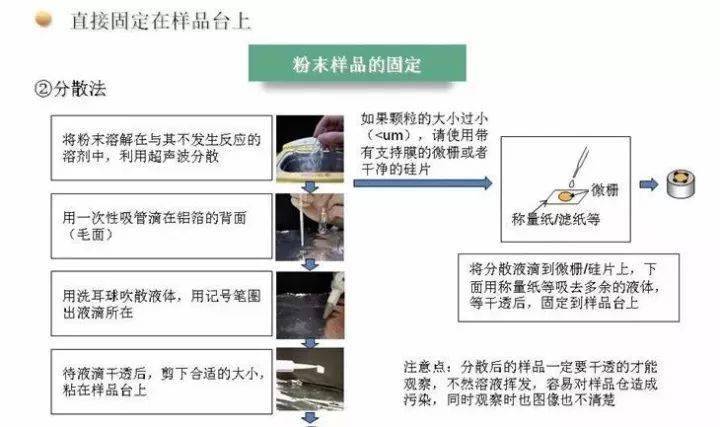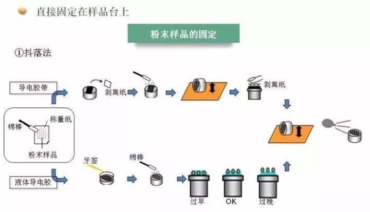 如果是液体导电胶,最好是用水溶性的,不容易和样品发生反应,撒样品的时间点控制在导电胶快干的时候撒,才能使样品达到半浸没状态。